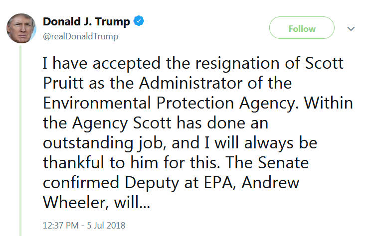 Thursday there was sudden breaking news all over social media. Environmental Protection Agency Administrator Scott Pruitt handed President Trump his resignation letter (and boy what a “Dear Leader” letter it was).