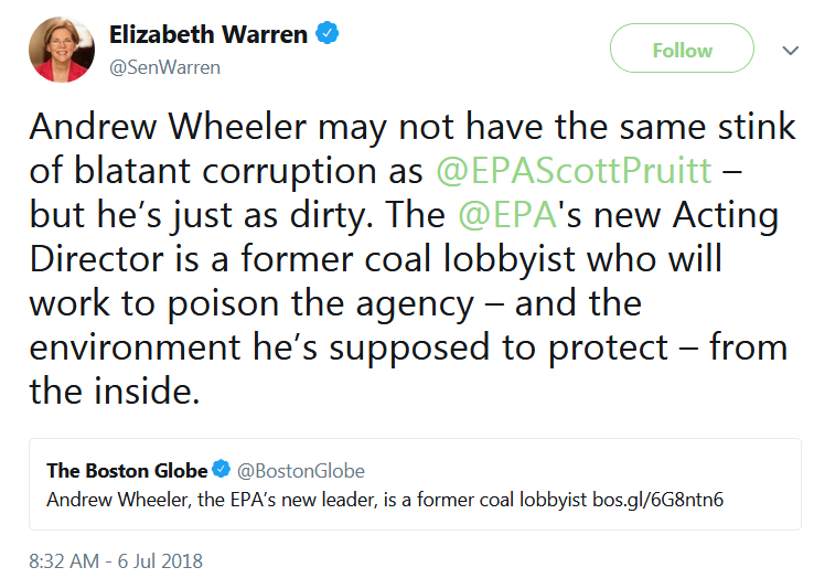 So what is next for the EPA? President Trump announced the new acting EPA administrator will be the current deputy administrator Andrew Wheeler. Wheeler is a former coal lobbyist, is known to be anti-regulation, and is working for an administration that is decidedly anti-environmental regulation. It is said that he is unlikely to be as corrupt as Pruitt and avoids the limelight.
